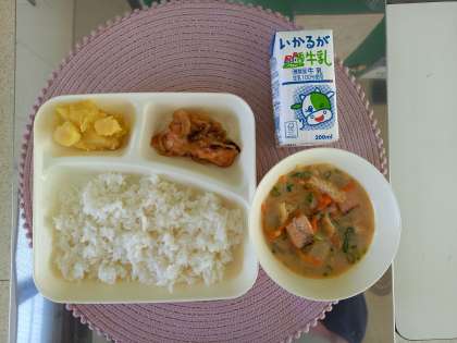 かす汁は、酒かす入れた具だくさんの汁ものです。酒かすの効果で体が温まるので、冬に食べられることが多いです。今日の給食のかす汁には、さけ・つきこんにゃく・うすあげ・だいこん・にんじん・青ねぎが入っています。酒かすのほかに、うす口しょうゆ・白みそ・赤みそで味つけしています。