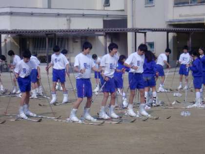 雪山のゲレンデで初めての着脱体験となると大変なので、体育の授業で着脱の仕方と身体の起こし方などを学びました。斜面で転倒した時など自力で向きを変えて起き上がるのは大変です。こんなに時間がかかっていては・・・。