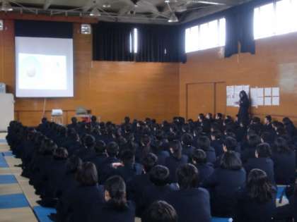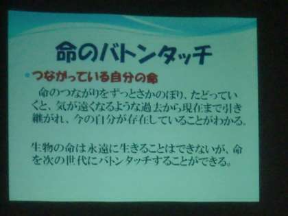 最初に学年の保健委員から「命のつながり」について、パワーポイントを使っての説明がありました。その後、「生命の誕生」について、私たち人類の神秘の世界を映像を通して学習しました。今、ここに居る私たち一人ひとりが、ずっと過去から続く命のつながりの中で存在し、かけがえのない存在であるとともに、また次の時代へ命を繋げる貴重な役割があることを再認識しました。そして、「命の尊さ」を忘れないように大切にしたいと思います。