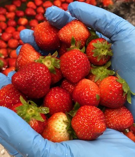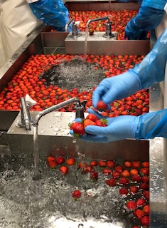1.2枚目の写真:給食調理員さんが、いちごを洗ってくださっている様子です。今日は1人3個ずつの配食だったので、3個×美津島中学校全員の人数=何個になるでしょう?ちなみに、同じ区内にある三国中学校の分のいちごも洗ってくれています。すごい数のいちごです。