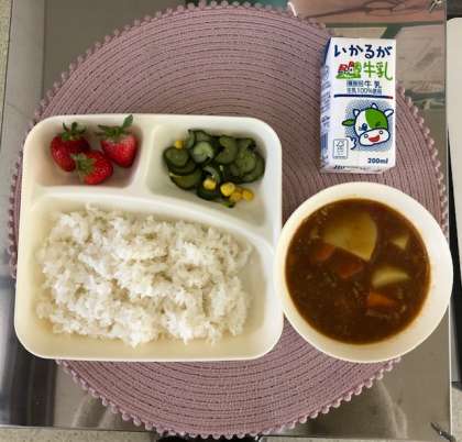 いちご:今日のいちごは「長崎県産♡恋みのり」という品種です。いちごは、ビタミンⅭ、食物繊維などを含む果物です。いちご3個で約24mgのビタミンⅭを摂ることができます。ビタミンⅭには、傷の回復を早めたり、抵抗力を高めたりするなどの働きがあります。