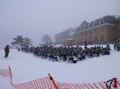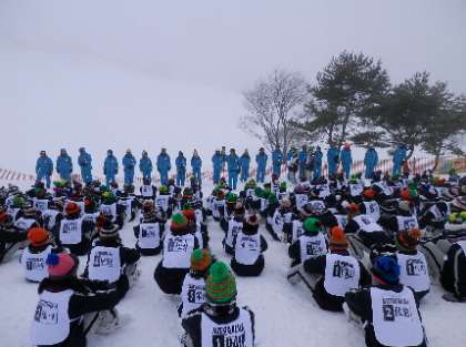 ホテル前のゲレンデで開校式を行いました。少しガスがかかっていますが、雪の量と質は最高です。