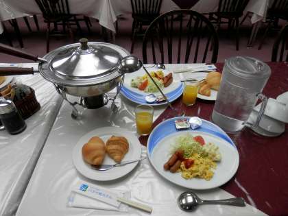・パン(自家製の手作りクロワッサン)・ソーセージ・炒り卵・野菜サラダ・コーンスープ・オレンジジュース