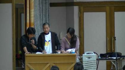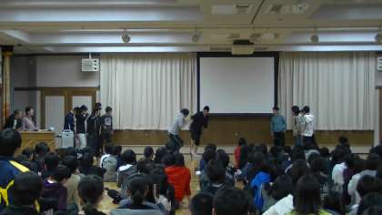 夕食後は、夜のつどいを行いました。学年内で有志の参加を呼びかけた結果、9組がエントリーされ、演技発表を行いました。学年全体で投票による審査を行い、M-1グランプリを決定しました。