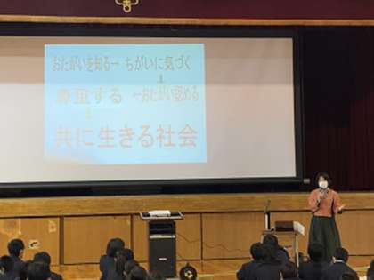 ソンセンニムをお迎えして、国際理解教育の一環として朝鮮半島にルーツのある人々について学習しました。日本の植民地政策の中で多くの韓国・朝鮮の人々が日本にやってきたことや差別についてご自身の生い立ちなども交えてお話しいただきました。最後に、これからますます進む国際化の中、様々なアイデンティティを持つ人々と共生する社会を作り上げることが大切だと話されました。