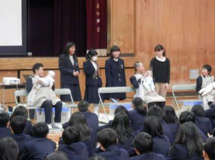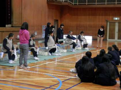 性教育の一つとして、日常生活を送る上で妊婦さんがどれほど大変かを少しでも感じてもらえる機会をつくろうと、十三市民病院から助産師さんに来校いただき、1年生が体験しました。約8キログラムの重りを腹部に抱え、靴下をはく動作をしたり、洗濯物を干したりする動きを通して、考えている以上に体に負担がかかっていることを体験しました。