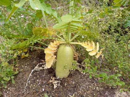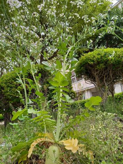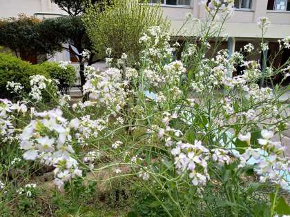 中庭に咲く、かわいらしい白い花。何の花かわかりますか?写真を下にスクロールしていくとわかりますよ。みんなもよく知っている野菜ですね。