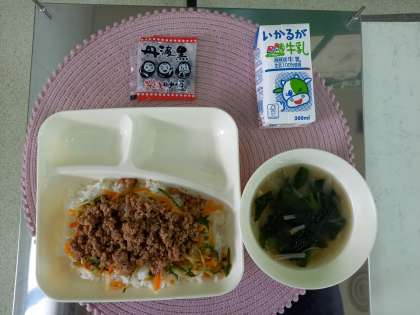 ビビンバ:ビビンバは韓国・朝鮮料理の一つで、ご飯とナムルや肉などの具を器に入れ、よくかき混ぜて食べる料理です。今日の給食では、ひき肉、きゅうり、にんじん、切り干し大根を具材にし、コチジャン、ごま油などで味つけしています。