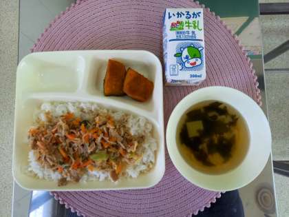 湯葉:湯葉は豆乳(とうにゅう)を煮て、表面にできた薄い膜(まく)を引き上げて作ります。引き上げて水分を切っただけの「生湯葉」、生湯葉を乾燥させた「干し湯葉」などがあります。消化が良く、たんぱく質・脂質・カルシウムなどを多く含んでおり、肉や魚を使わない精進料理(しょうじんりょうり)によく使われます。今日の給食では、「干し湯葉」をもどしてすまし汁に使っています。