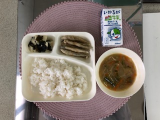 写真2枚目は、本日の給食です。メニューは、きびなごてんぷら、豚汁、わかたけ煮、ご飯、牛乳です。