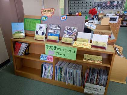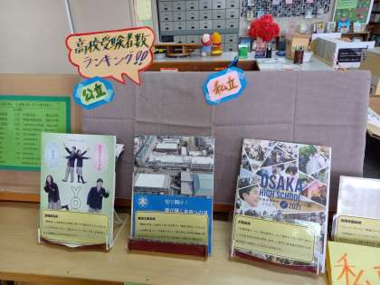 図書室内に、高校の学校案内パンフレット(昨年度分)を集めた進路ブースが誕生しました。特集では、公立高校と私立高校に分けて、過去5年間の卒業生の進路先ベスト10を紹介しています。他にもたくさんの専修学校などのパンフレットもあります。3年生は、ぜひ足を運んでくださいね。