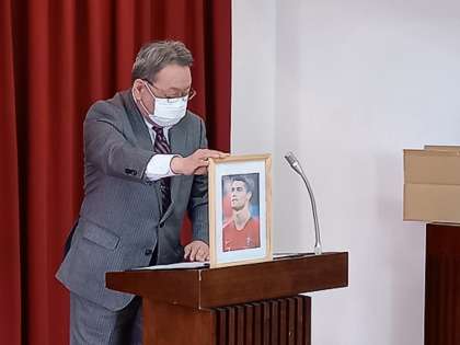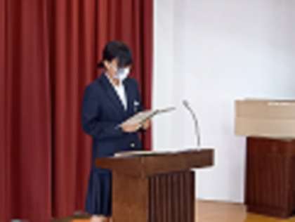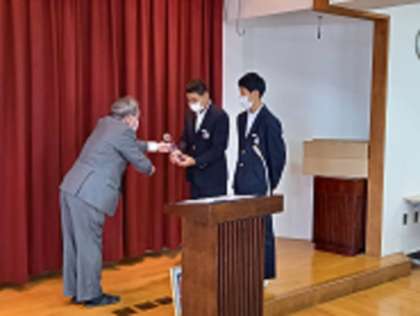 本日の全校集会も先週に引き続きオンラインで行いました。まず初めに「SPRING FESTIVAL」で優勝したサッカー部の表彰伝達を行いました。表彰状の授与とともに、クリスタルのトロフィーの授与も行いました。