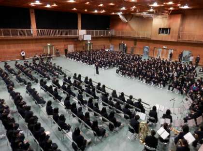 吹奏楽部の演奏のもと、在校生が体育館内で3年生を拍手で迎え入れることから始まりました。