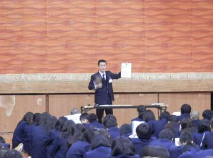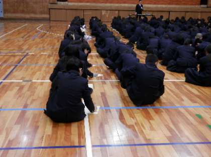 また、1年生では、淀川区役所の保健福祉課より管理栄養士さんに講師として、来校いただき、朝食の大切さについての授業を受けました。淀川区の中学生アンケート調査結果を活用してのお話しでしたが、そのアンケート結果によると、淀川区の中学生の平均朝食喫食率が80.4%であるのに対して、本校の結果が71.8%しかなかったことが非常に気になりました。さらに、朝食の喫食率と就寝時間が関連しており、本校の1年生の就寝時間が深夜12時以後に49.8%もあることが分かりました。早く寝て十分な睡眠時間をとるようにしましょう。