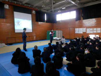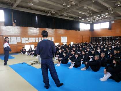 本校の卒業生、泉木さんに来校していただき、6限目の時間(格技室)を活用して、1年生を対象に「チアリーディング」についての体験談や、画像を使っての講話をしていただきました。ひとつの事に全力で取り組んでいる先輩の姿勢に1年生の生徒たちは、たいへん感動していました。