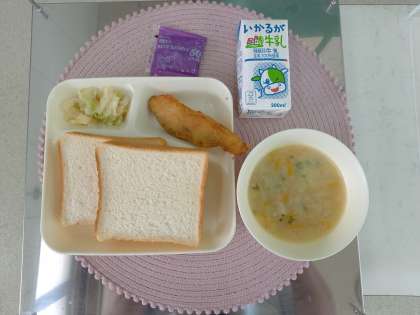 豆乳:大豆を一晩水に浸ひたしておいてからすりつぶし、これに水を加えて加熱して、その煮汁(にじる)をしぼったものが豆乳です。とうふやゆばの材料にもなります。今日は、豆乳スープに使用しています。
