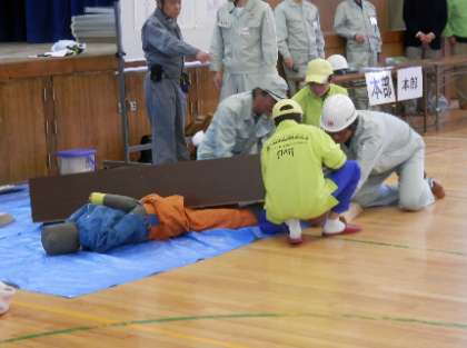 午前10時から三津屋小学校において、三津屋地域の防災訓練が行われました。本校から防災リーダーが9名参加し、地域の方々と一緒に訓練に取り組みました。最初に地震発生時の傷病者運搬方法や家具の下敷きになった人の救助方法について、展示訓練を行い、地域の方々と共に3班に分かれて訓練を行いました。