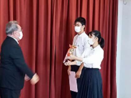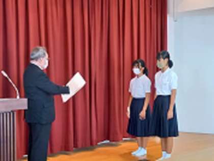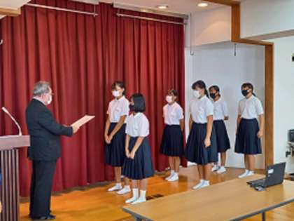 本日、1限目に2学期オンラインにて始業式を行いました。まず初めに、夏休み中の各部活動でいただいた表彰状の授与を行いました。