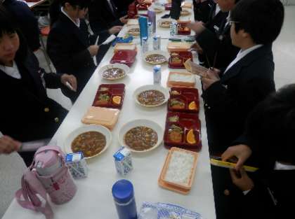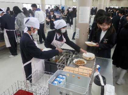 各学級では、係生徒が食缶で用意されたカレールーを食器に盛りつけていました。味は、なかなか好評のようです。