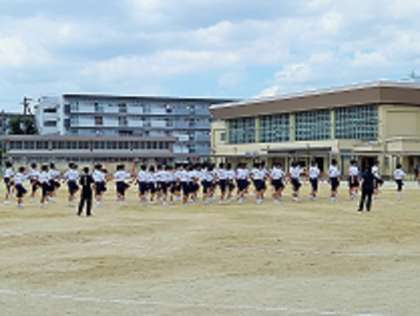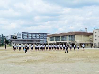 8月も今日で最後です。中庭の蝉の声もしだいに聞こえなくなってきました。日差しはまぶしいですが、太陽が雲に隠れると暑さも少し和らいできます。体育祭に向けての練習も始まりました。今年も昨年同様、短縮して9月16日(木)午前中に開催の予定です。写真は、1年生の体育(体育祭練習)の様子です。