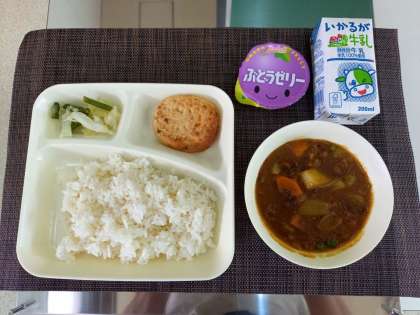 ビーフカレーライス:いつもの給食に使っているカレールウの素は、小麦粉、油脂、カレー粉、香辛料などで作られていて、カレーに味をつけたり、とろみをつけたりするために使います。今日のカレーライスには、小麦粉の代わりに米粉を使ったカレールウの素が使われています。