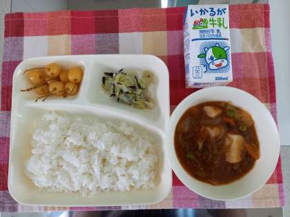 ハヤシライス:いつものハヤシライスは、小麦粉を油でいためて作る「ブラウンルウ」でとろみをつけていますが、今日は、「ブラウンルウ」の代わりに「米粉(上新粉)」を使っています。ルウを使用しないことで、いつものハヤシライスに比べるとあっさりとした味わいになります。