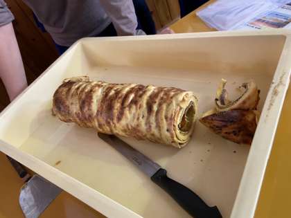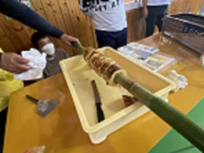 選択体験のようす(バウムクーヘン)焼き上がり第1号です。