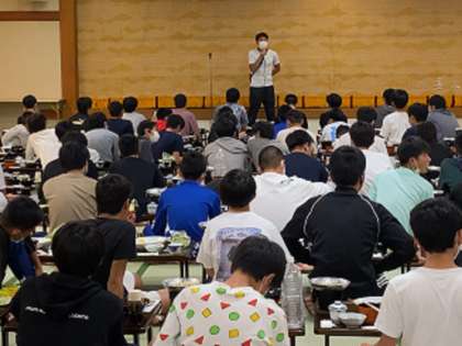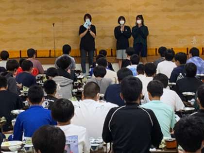 「ごちそうさまでした。」の後、夕食後の連絡がありました。19時45分から「夜の集い」を行います。