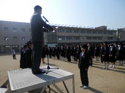 朝の陽射しが少し暑く感じられるような中で、本日は全校集会を行いました。土日に頑張った部活動で表彰状をいただいた仲間に、賞状の伝達を行いました。バドミントン部と剣道部で賞をいただきました。土日も各部活で春季大会が行われましたが、遠方の会場にもかかわらず、応援に駆け付けていただいた保護者の皆様、どうもありがとうございました。このゴールデンウイーク中にも大会が行われます。ぜひ応援のほどよろしくお願いいたします。