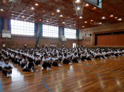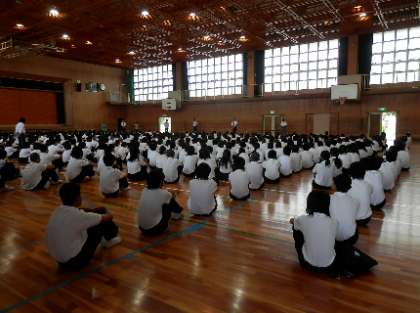 夏休み中の部活動の表彰式から行い、校長先生の話、奥野先生の話がありました。