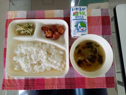 オーロラ煮:オーロラ煮は、大阪市の給食で考えられた料理です。この名前は、南極などの空に現れる、朝焼けのような赤い色をしたオーロラからつけられました。仕上がりを、オーロラの赤い色に似せるため、たれにはケチャップを使っています。また、赤みそと砂糖を加え、たれの味つけを工夫しています。今日は、油であげたまぐろに、赤いたれをからめた『まぐろのオーロラ煮』です。
