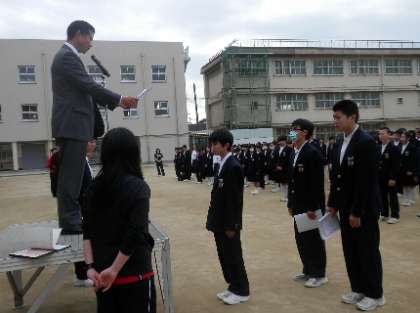 前期生徒会のメンバーが、自己紹介をし、平成27年度の前期学級役員の認証状を読み上げ、各学年の代表者に手渡しました。各委員として、学級の代表として活躍してほしいと思います。日常の日直と各教科係りの仕事も同じだと思います。学級の仲間として、それぞれが協力できる関係でいてください。