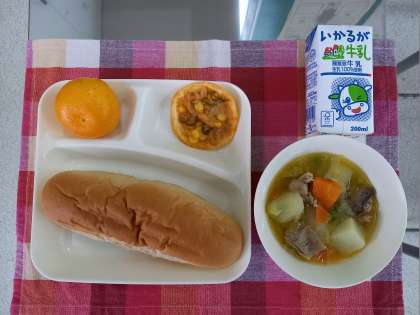 変わりピザ:ピザは、イタリアの南部ナポリ地方の料理で、イタリアではピッツァとも呼ばれています。小麦粉とイーストで作ったピザ生地に好みの具をのせ、オーブンで焼いた料理です。今日は、ピザの生地の代わりにぎょうざの皮を使った変わりピザが登場します。給食の変わりピザは、ぎょうざの皮にピザソース、ツナ、コーン、ピーマン、チーズをのせて、焼きもの機で焼いて作ります。