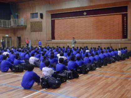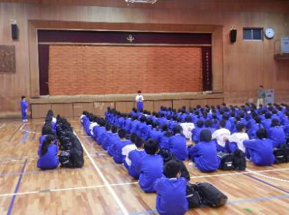 8:25集合完了し、体育館で朝の出発式を行いました。出発式では、生徒の司会進行のもと教頭先生と学年生徒会代表から一泊移住での目標などについて話がありました。