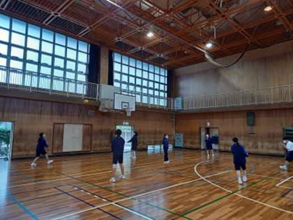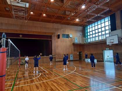 体育館で2年生女子がバレーボールに取り組んでいます。
