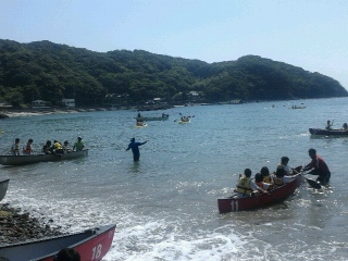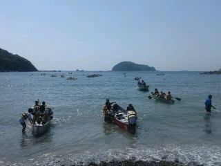 いよいよ海の活動が始まりました。カヌーは、5人〜6人で呼吸を合わせて水をかいて進みます。