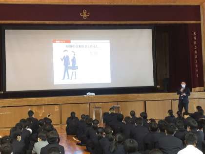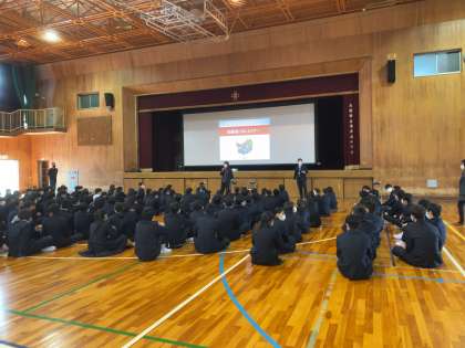 5限、3年生を対象に体育館で「制服着こなしセミナー」を行いました。来月には、私立高校入試に向けた「面接練習」をする予定です。人の第1印象は、3〜5秒で決まるとされています。(メラビアンの法則)面接室に入ってきたときの制服の着こなし、動作などが決め手になります。TPO≪T=Time(時間)P=Place(場所)O=Occasion(場面)≫に合わせてフォーマルとカジュアルを着こなすのがベストです。入試はもちろんフォーマルですね。