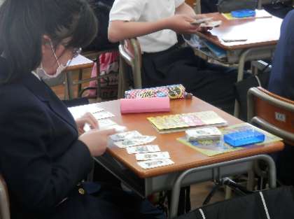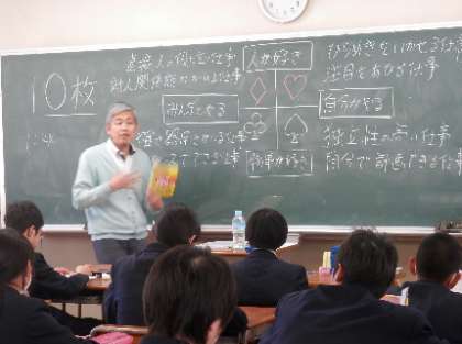 2年生では、キャリア教育のひとつとして、外部より講師の先生を招き、学習会を行いました。各学級活動の時間を活用し、カードを使って自分の性格等を自己分析することで、「自分がどんな仕事にむいているのか」について考える学習を行いました。自分の個性を見事に判定され、生徒もびっくりする様子が伺えました。