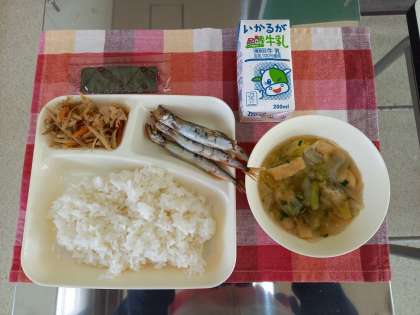 ししゃも:ししゃもは、北海道の太平洋岸にすむキュウリウオ科の魚です。10月中旬〜11月下旬になると、特定の河川に群れを成し、砂の多い川底で産卵します。卵からかえった稚魚は、海で回遊しながら1年半くらいかけて成長し、多くのししゃもが産卵のために再び河川をさかのぼります。給食に使われているししゃもは、カラフトシシャモ(カペリン)と呼ばれる魚です。