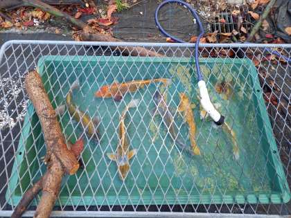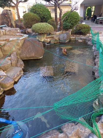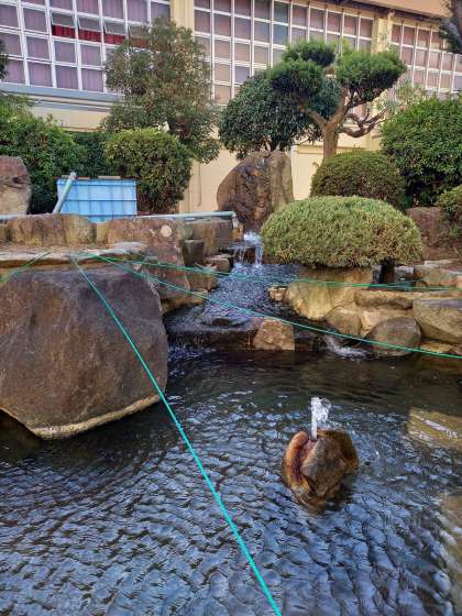 管理作業員さんが、池の清掃をしてくれました。清掃前は、汚れがひどく、寄生虫が発生する原因にもなっていました。一度水を抜いてから池全体を高圧洗浄し、新たに水を入れ替えました。避難している鯉がもとの池にもどれるのももうすぐです。