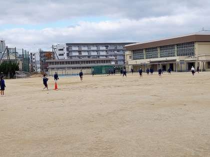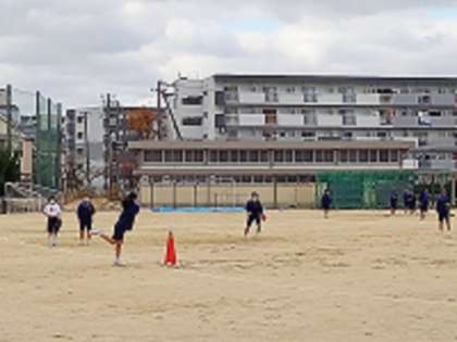 雨上がりのグランドでは、1年生女子の体育でソフトボールを行っています。通常のソフトボールでは、投手がボールを投げますが、なかなかバットにボールに当てることが難しいので、コーンの上にペットボトルをつけて、その上に乗せたソフトボールをバットとで打つところから始めています。