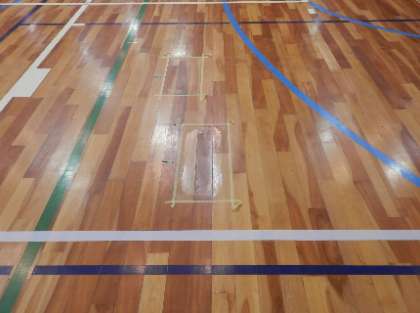 また、このテストを利用して、体育館の床の補修工事と防球ネットの修理をしてもらいました。