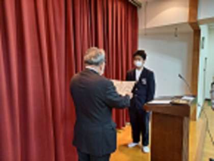 校長先生のお話しの前に「中学生の税についての作文」における優秀賞の賞状と記念品の授与が行われました。おめでとうございます!
