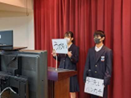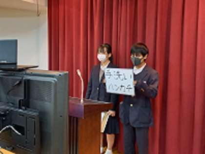 校長先生のお話しに続いて、保健食育委員会から「手洗いをしたあとには、必ずハンカチで手を拭くこと」「こまめにうがいをすること」についての呼びかけがありました。