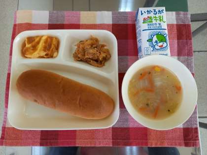 プリン:プリンの語源は、イギリス発祥の「プディング」といわれています。イギリスでは蒸したり、焼いたりしたやわらかい料理のことを「プディング」と呼んでいます。日本には、菓子の「カスタードプディング」が伝わり、それを「プリン」と呼ぶようになったそうです。今日の給食には、卵、牛乳、砂糖、クリームを使い、蒸し焼きにした「焼きプリン」が登場します。