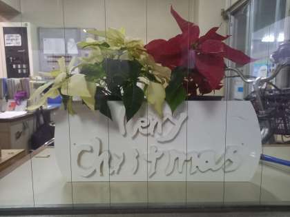 管理作業員室窓口には、紅白のポインセチアが飾られています。