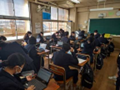 (中)2年生 1人1台端末で生徒アンケートをしています。