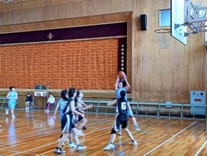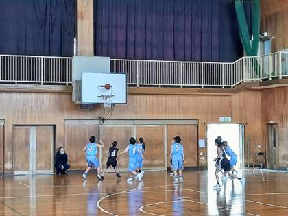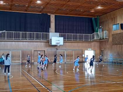 体育館では、男女バスケットボール部が練習試合を行っています。