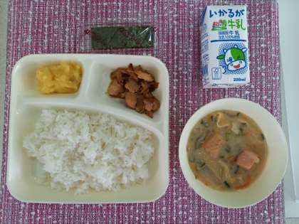 かす汁:かす汁は、酒かすを入れた具だくさんの汁ものです。酒かすは清酒をしぼったあとに残る固形物で、体を温める効果があります。冬に食べられることが多いです。今日の給食のかす汁には、さけ、つきこんにゃく、うすあげ、だいこん、にんじん、青ねぎが入っています。酒かすのほかに、うす口しょうゆ、白みそ、赤みそで味つけしています。
