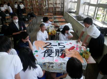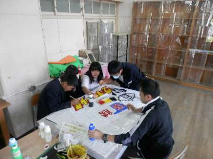 放課後には、体育祭で各学級の応援旗となる旗の作成が始まっています。